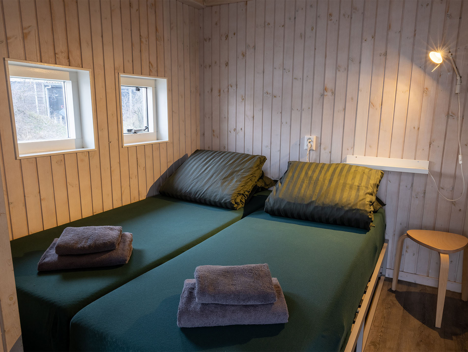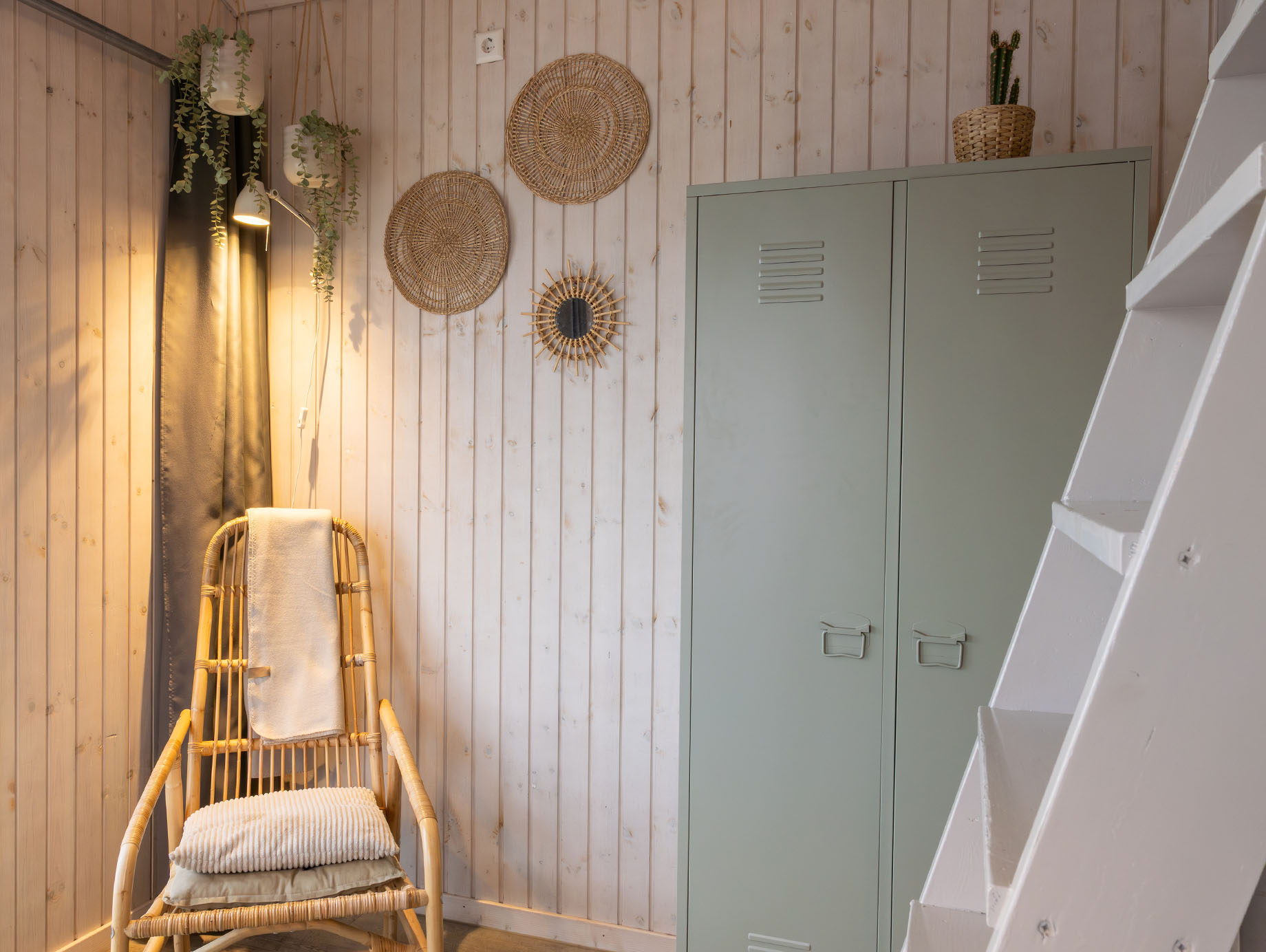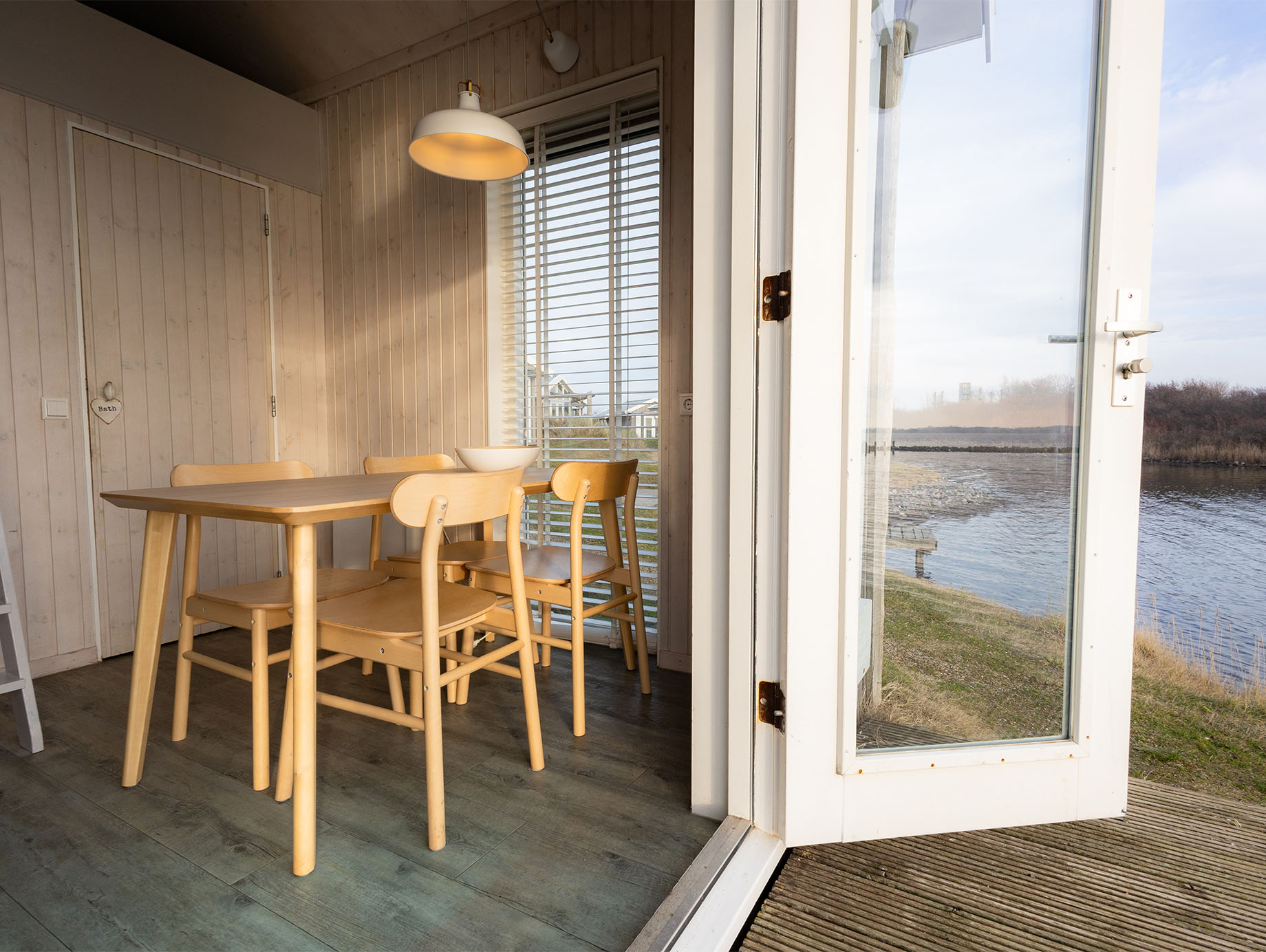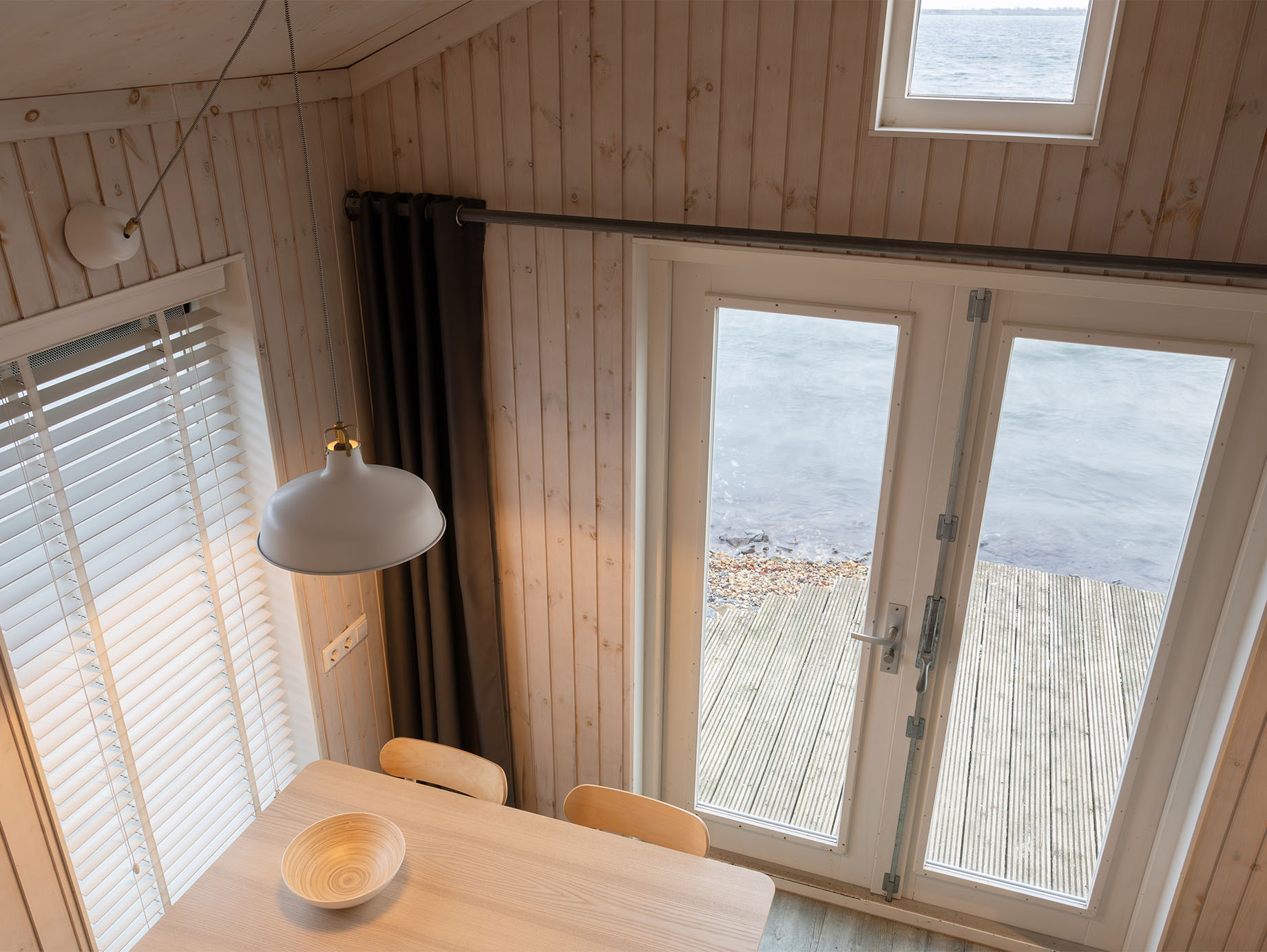 Via het eigen houten terras wordt door de openslaande deuren de lichte living betreden, ingericht met een eettafel, vier stoelen en een loungestoel die desgewenst ook buiten geplaatst kan worden. Achter het zitgedeelte bevindt zich een open slaapruimte met een comfortabel tweepersoonsbed met twee eenpersoonsmatrassen. Via de trapladder is de vide bereikbaar, waar twee eenpersoonsbedden extra slaapruimte bieden. In de metalen kast is ruimte voor het opbergen van kleine persoonlijke spullen.