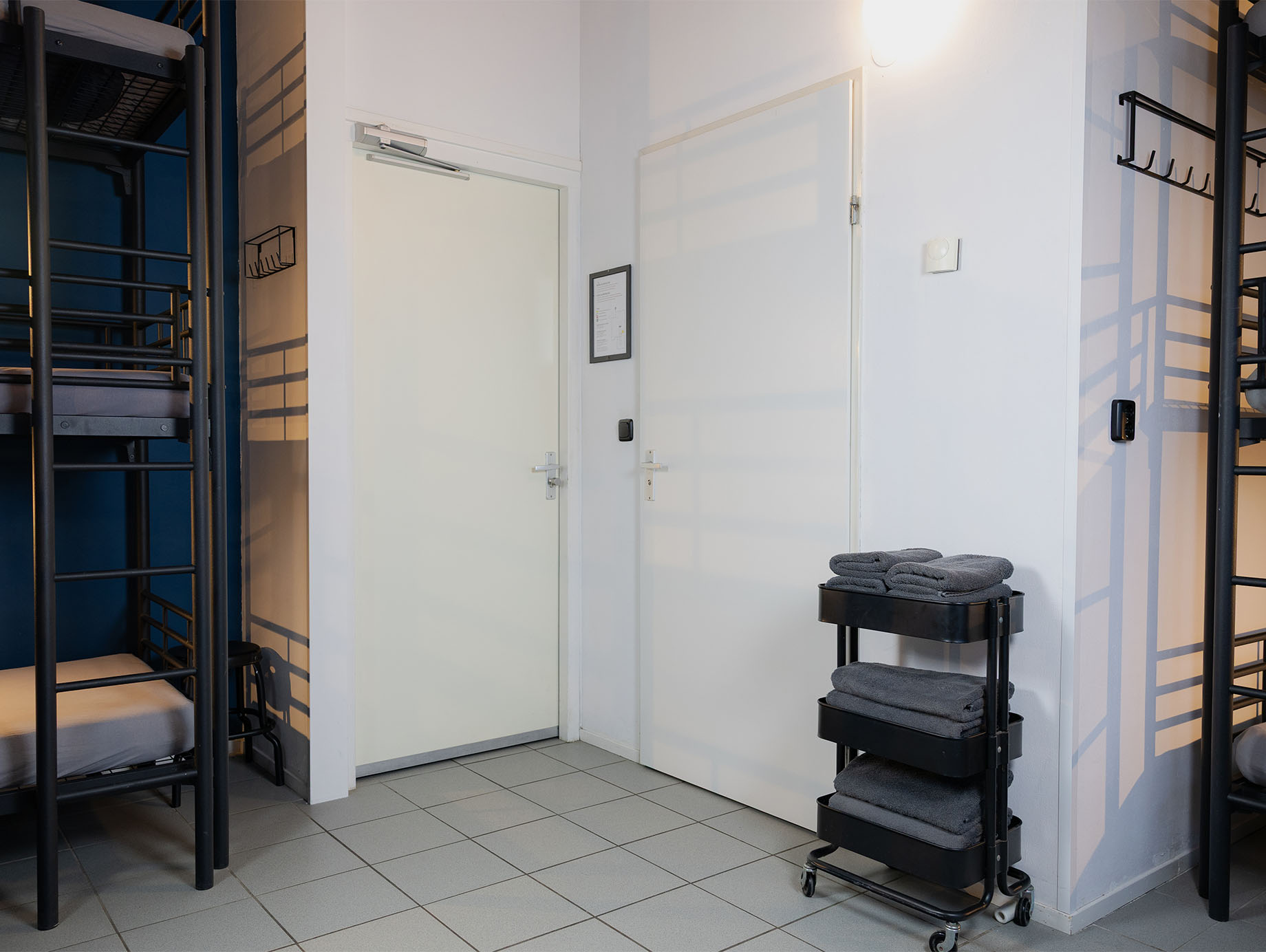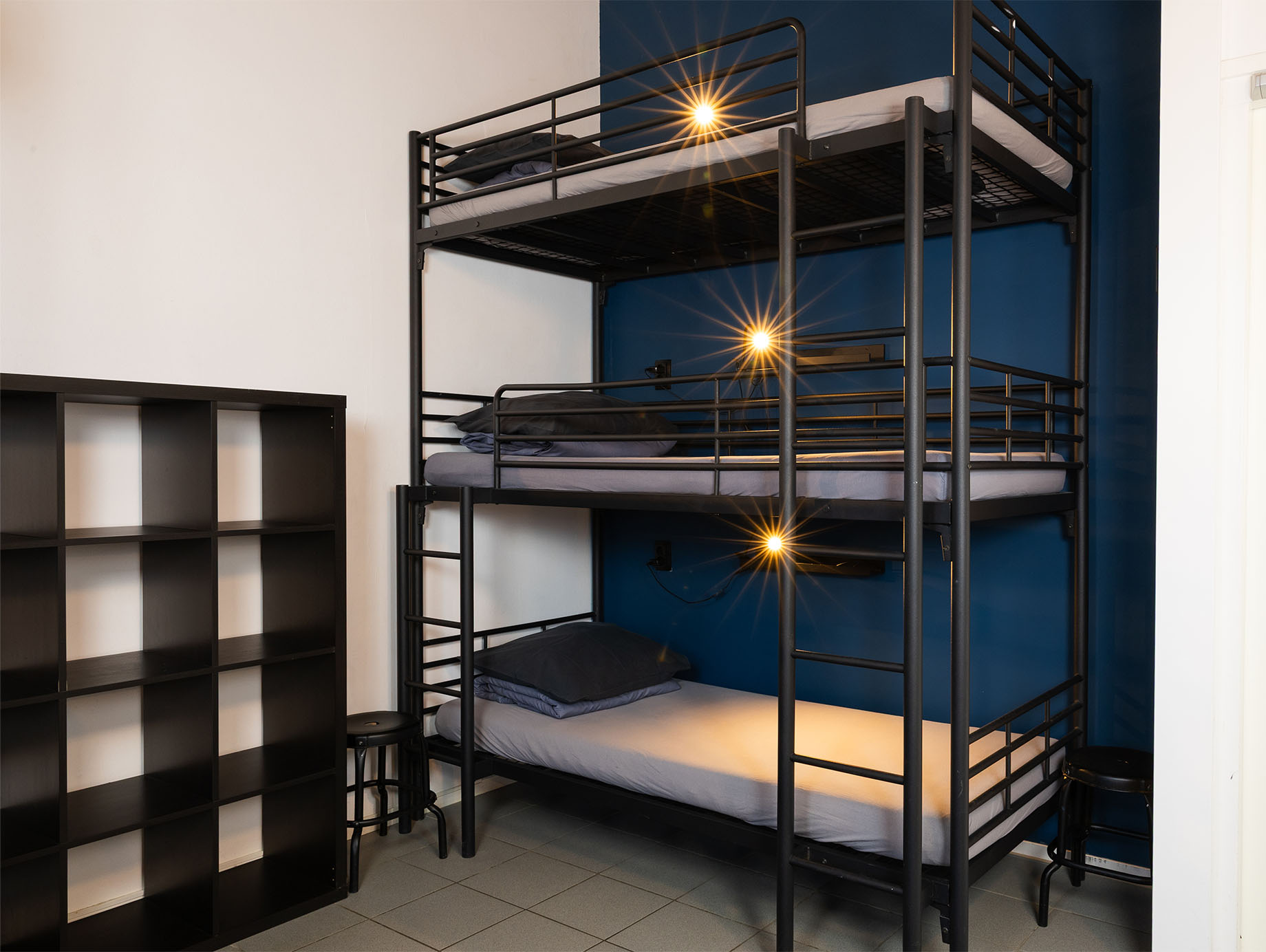 Deze Budget Room van 24 m² bevindt zich op de eerste verdieping en is praktisch ingericht met drie stapelbedden van drie hoog, geschikt voor maximaal acht tot negen personen. Een open vakkenkast biedt ruimte voor het opbergen van kleine persoonlijke spullen.