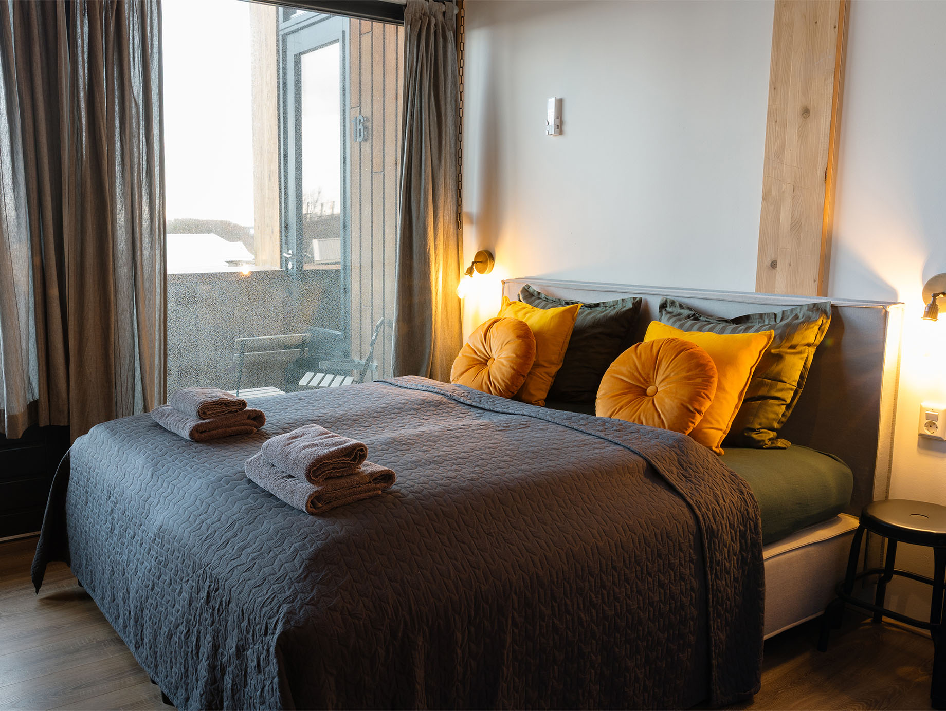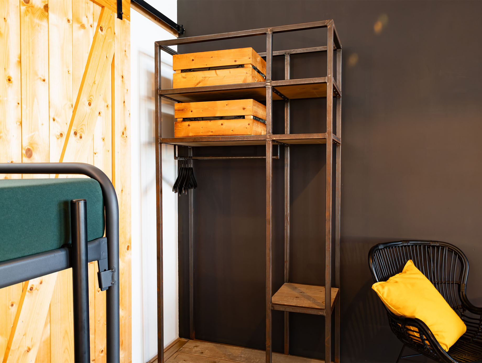 De kamer op de eerste verdieping is ingericht met een tweepersoons boxspring met eenpersoonsmatrassen en een stapelbed. Daarnaast is er een zitje met twee stoelen, een salontafel en een open kledingrek aanwezig. Achter de houten schuifdeur bevindt zich de moderne badkamer met douche, toilet en twee wastafels.
