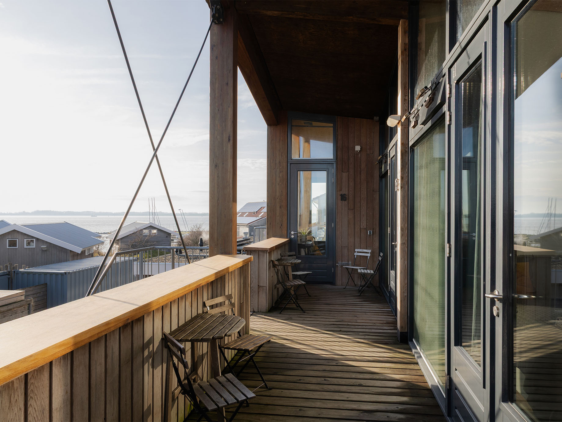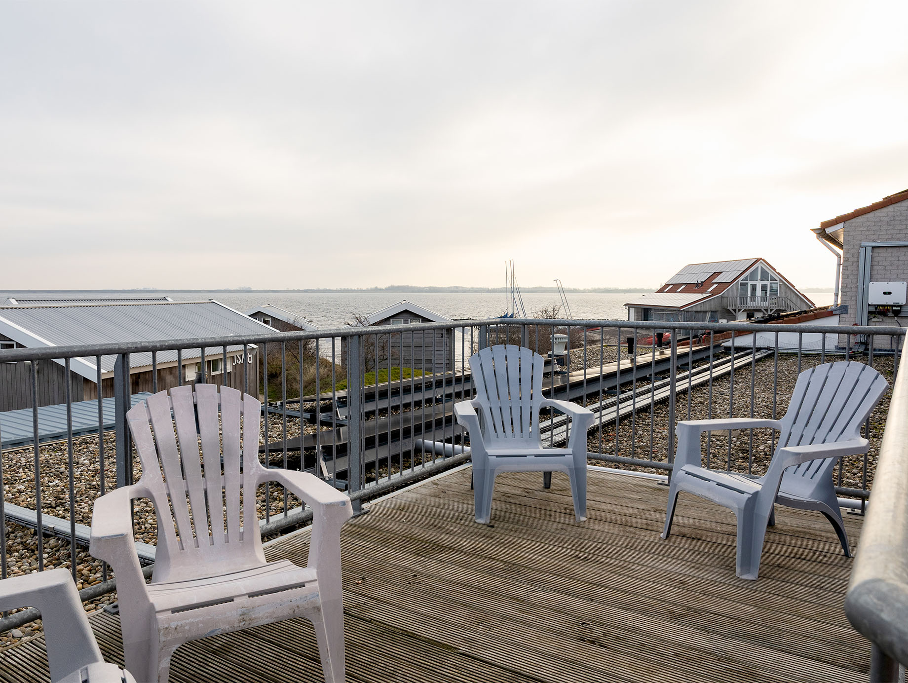 Het privébalkon is ingericht met loungestoelen en een salontafel en biedt een fijne plek om te ontspannen en van het uitzicht te genieten.