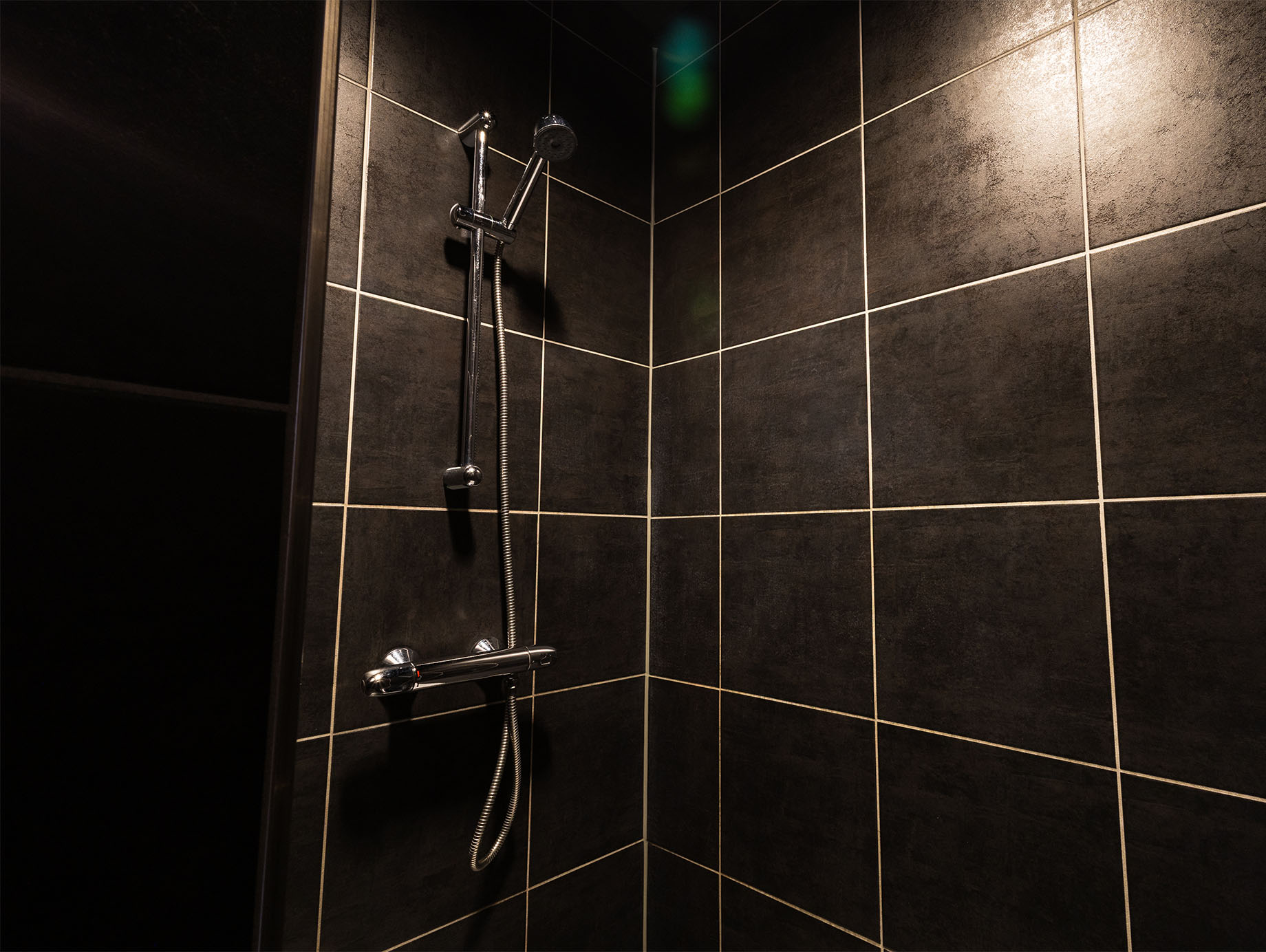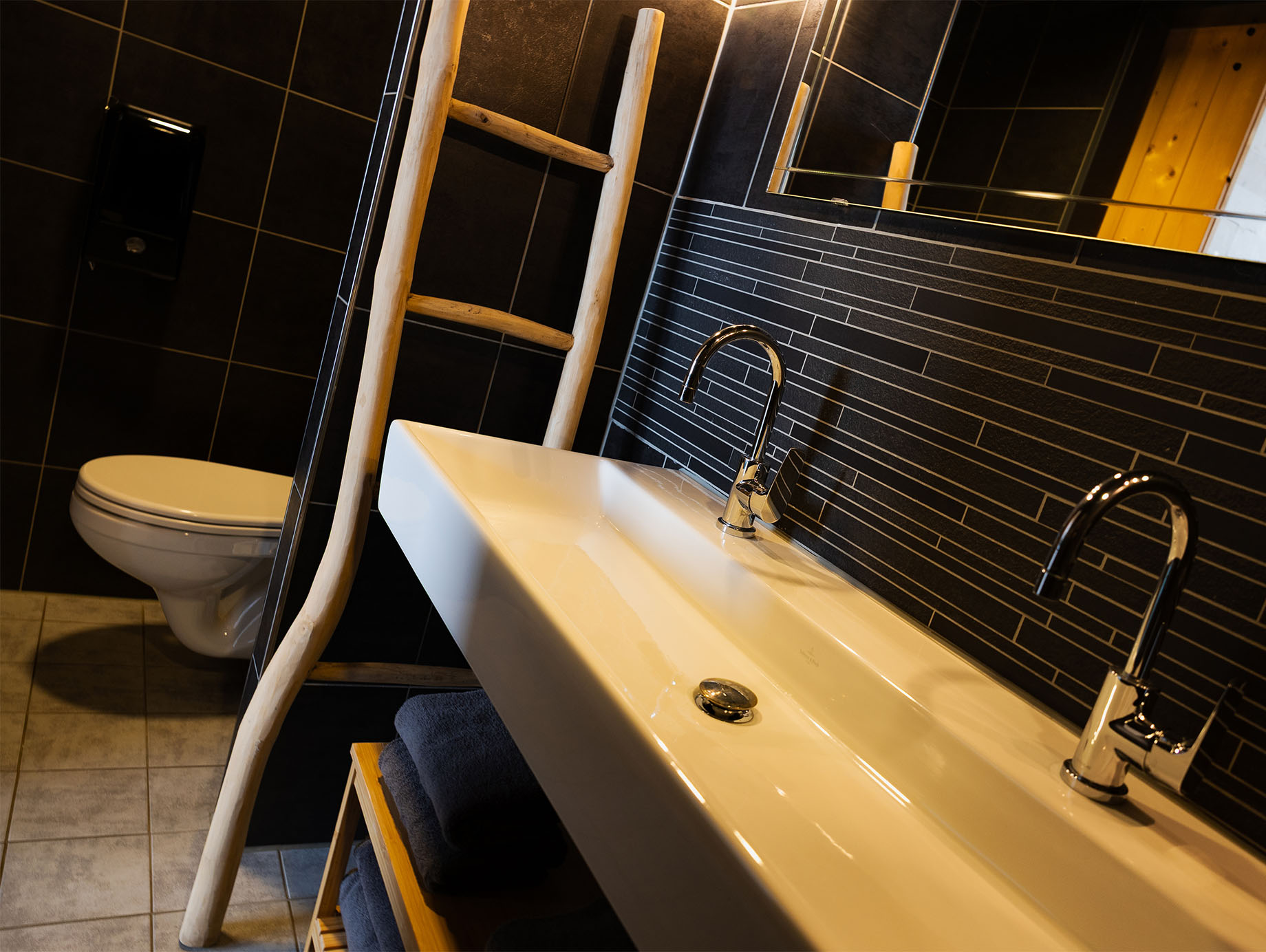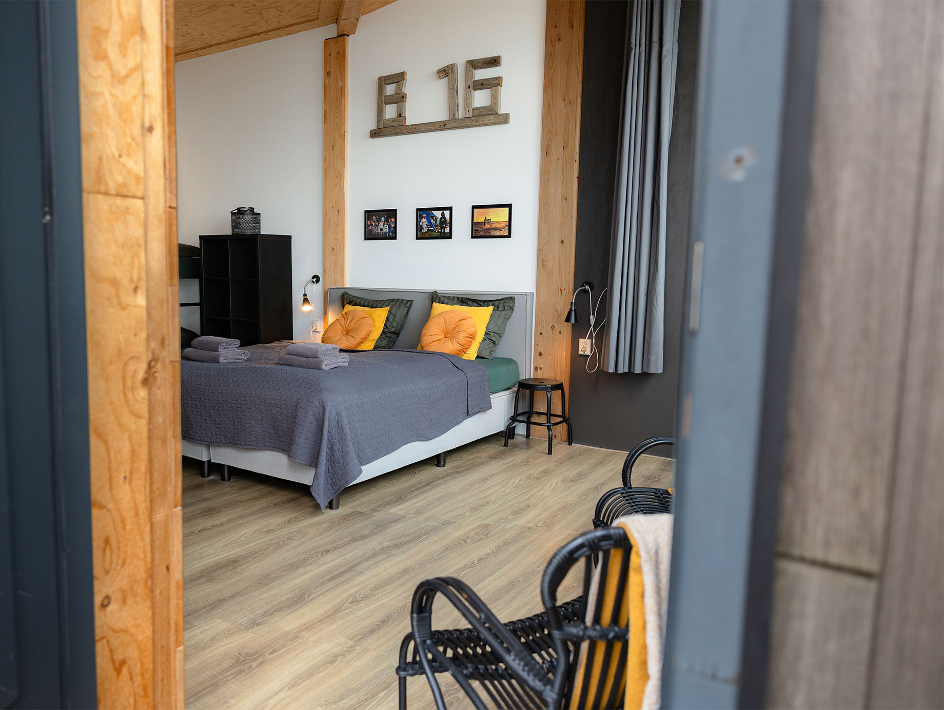 De ruimte beschikt over een zitje met twee stoelen, een salontafeltje en een open kledingrek. Achter de houten schuifdeur bevindt zich de moderne badkamer met douche, toilet en twee wastafels.